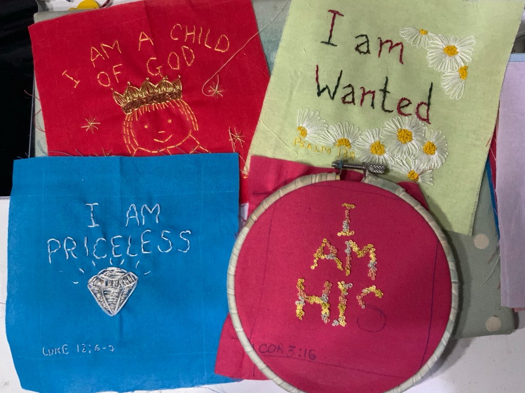 Combining Slow Stitching, Embroidery and Quilting, the quilts of hope project embroiders messages of love and hope onto cotton squares.