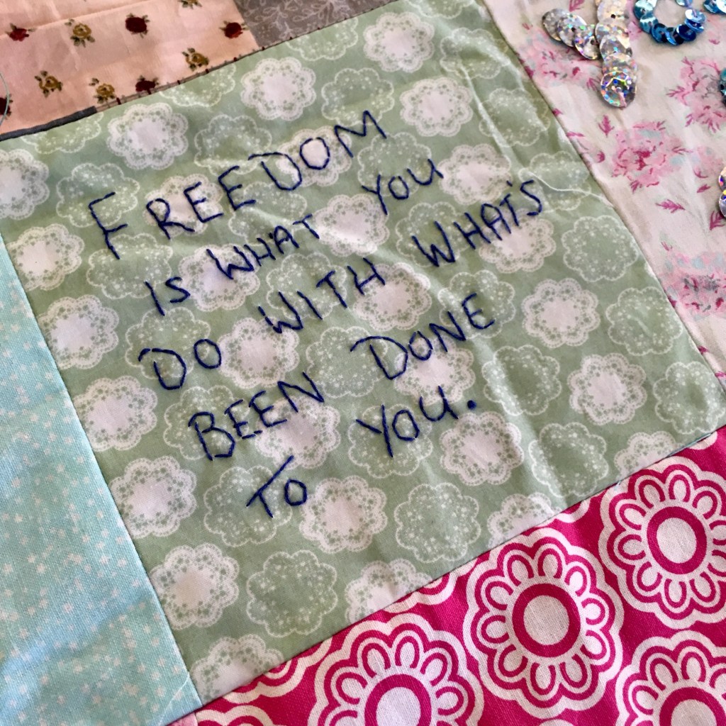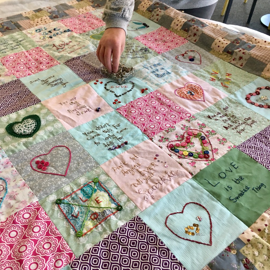 These squares are sewn together into a quilt which is then sent to a safe house for vulnerable women.